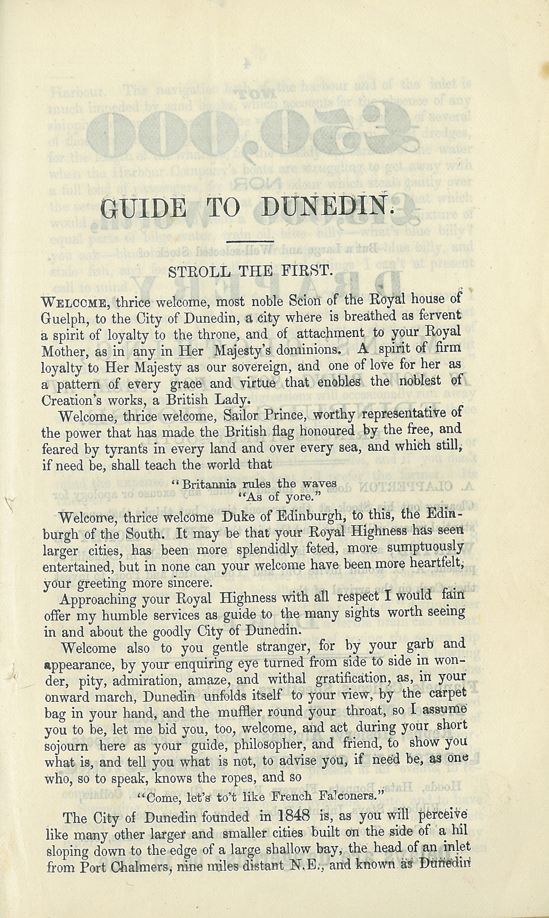 Dr Hocken was obviously not amused with the ‘Welcome, thrice welcome’ pamphlet produced by the triumvirate of Grimshaw, Bagshaw & Bradshaw in Dunedin in 1869. In his Bibliography, he dismisses it: ‘Written when the Duke of Edinburgh visited Dunedin. Of no value beyond its reference to old places, persons, and things.’ Even Port Chalmers received their barbed humour. One option offered in getting to Dunedin was ‘By air. You may come over in a balloon provided you have one, you will find no lack of gas amongst the residents of Port…’.